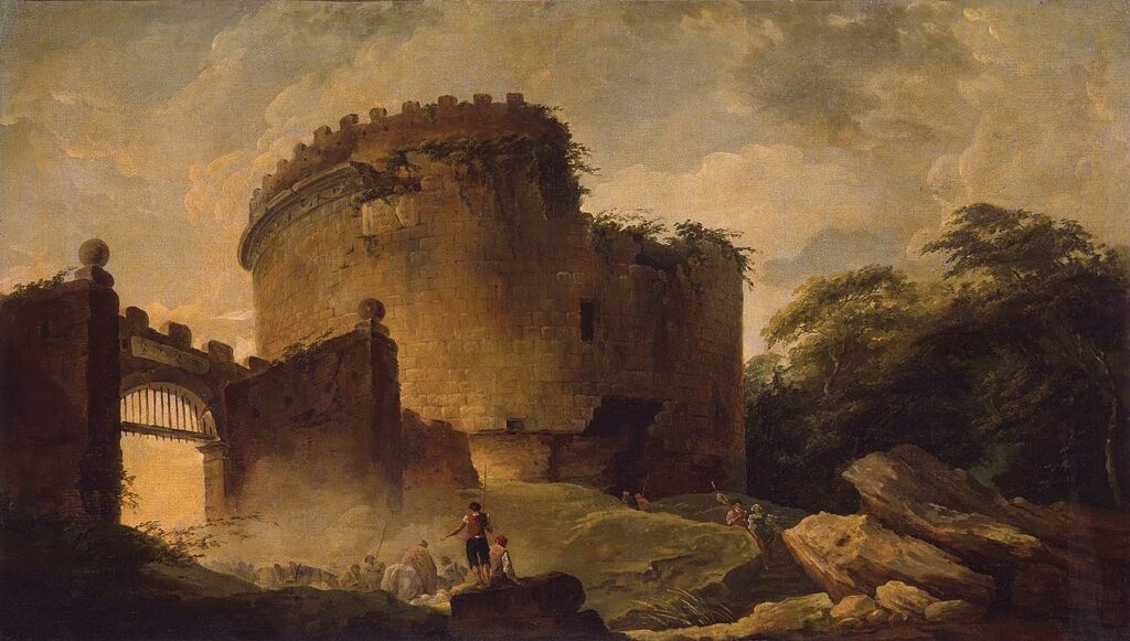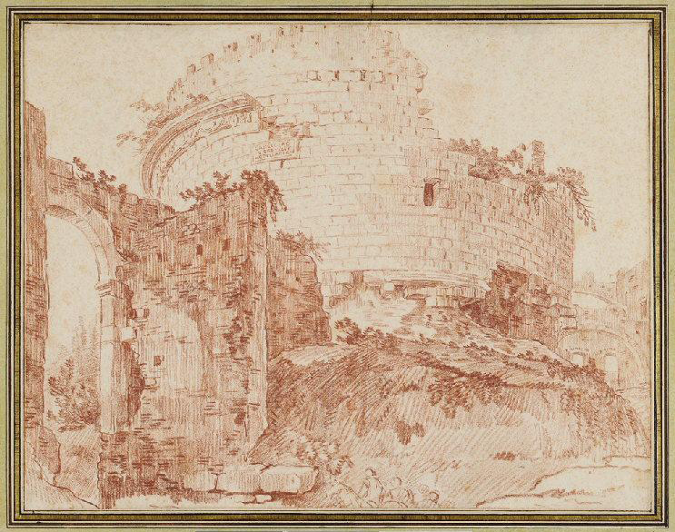Notre dessin représente les ruines du mausolée de Caecilia Metella[1], édifié au Ier siècle avant J.-C. sur la voie Apienne, dans les environs de la Rome. Transformé en forteresse au XIIIe siècle et surélevé en 1302, le monument devient, dès le XVIIe siècle, l’un des sujets de prédilection des peintres. L’environnement du tombeau, paysage ou architecture, pouvait être librement réinvité par les artistes au gré de leur imagination.
